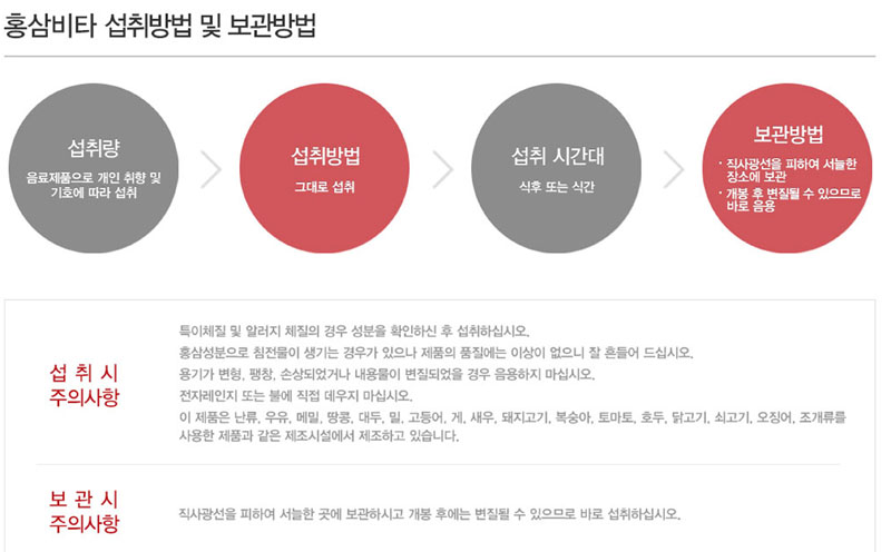 | 원재료명 및 함량 | 홍삼농축액(6년근, 고형분 60%, 홍삼성분 70 mg/g이상, 국산) 0.15%, 정제수, 액상과당, 사과농축액(국산), 비타민C, 구연산, 판토텐산칼슘, 니코틴산아미드, 비타민B1염산염, 비타민B2인산에스테르나트륨, 비타민B6염산염, 덱스트린, 맥아당, 홍화황색소, 합성착향료(드링크향) |